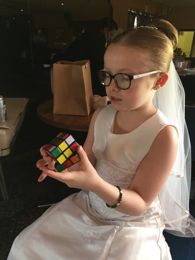 Sophie trying to beat Stuart’s time completing the rubix cube.