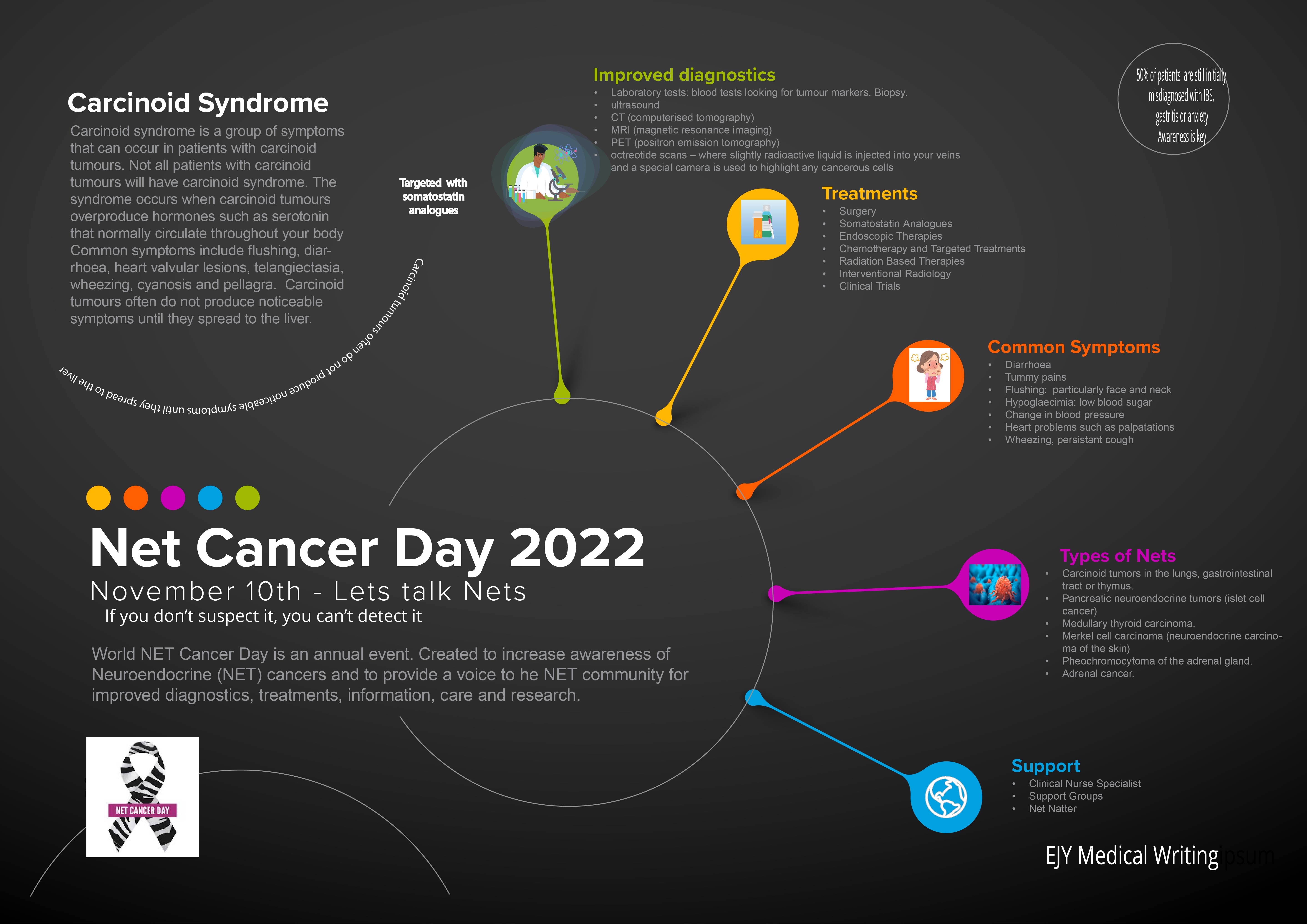 Today is Net Cancer Day. November 10th is the annual awareness day for Net Cancer. So many people wait for a long time for a diagnosis. Go back and forth to their doctors with symptoms and get told it is irritable bowel or something else other than the actual cancer. When Doctors are taught ‘when you hear hoofbeats, think horses not zebras,’ meaning a doctor should first think about what is a more common—and potentially more likely—diagnosis. Net Cancer and Carcinoid Syndrome is rare hence not the first thing the doctor looks for. Awareness needs to be raised for this cancer. Today is NET Cancer Day and the hope that the message gets around the world – raising awareness of this cancer.