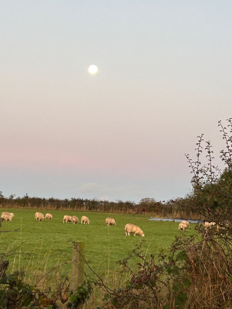 When I got up in the morning, I ventured out the front door, in our front field the sheep were accompanied by the harvest moon. It was a beautiful site.