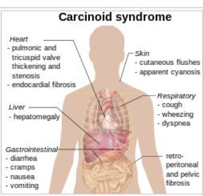 Common symptoms include flushing, diarrhoea, heart valvular lesions, telangiectasia, wheezing, cyanosis and pellagra.